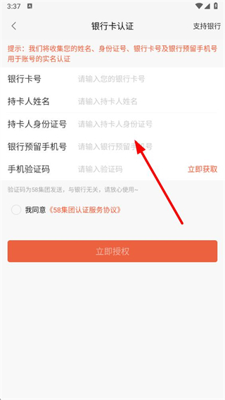 4、在頁面依次填寫銀行卡號和個(gè)人信息,獲取并填入驗(yàn)證碼,勾選協(xié)議后點(diǎn)擊立即授權(quán)完成認(rèn)證。