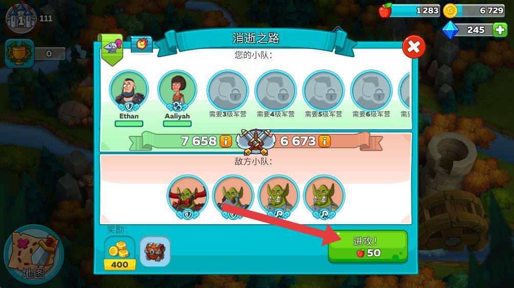 3、在地圖中選擇好戰(zhàn)斗關(guān)卡,點(diǎn)擊進(jìn)攻。