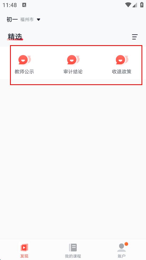 4、完成地區(qū)和年級選擇后,進(jìn)入精選頁面,可根據(jù)需要點(diǎn)擊“教師公示”“審計(jì)結(jié)論”“收退政策”等選項(xiàng),查看相關(guān)內(nèi)容。