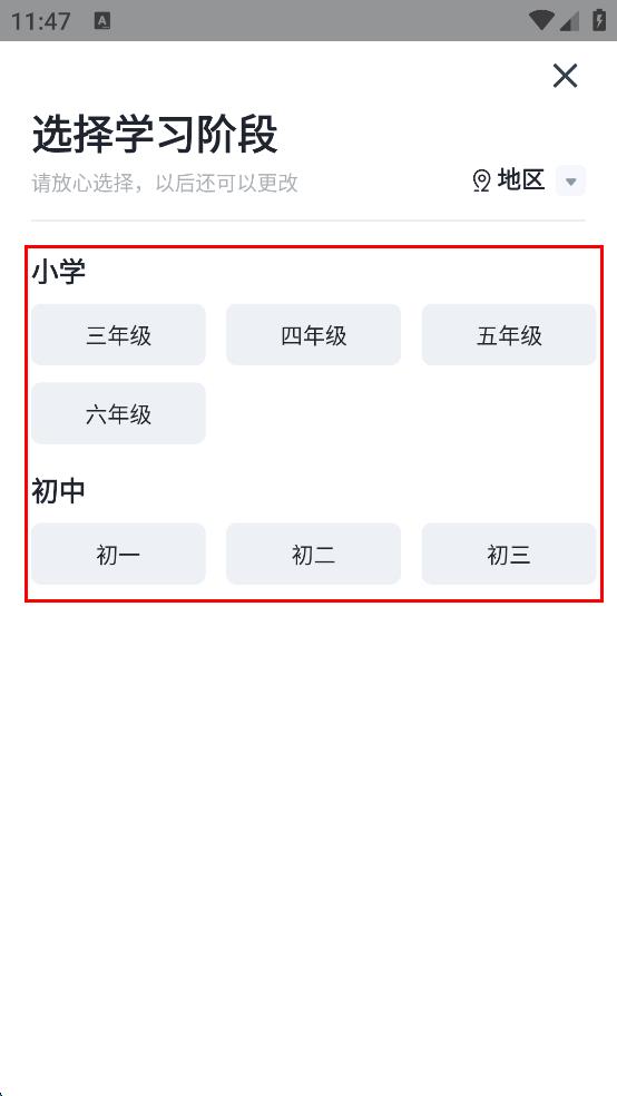 3、進(jìn)入“選擇學(xué)習(xí)階段”頁面后,先點(diǎn)擊右上角“地區(qū)”選項(xiàng),選擇所在地區(qū),然后在小學(xué)或初中的年級選項(xiàng)中,點(diǎn)擊對應(yīng)的年級。