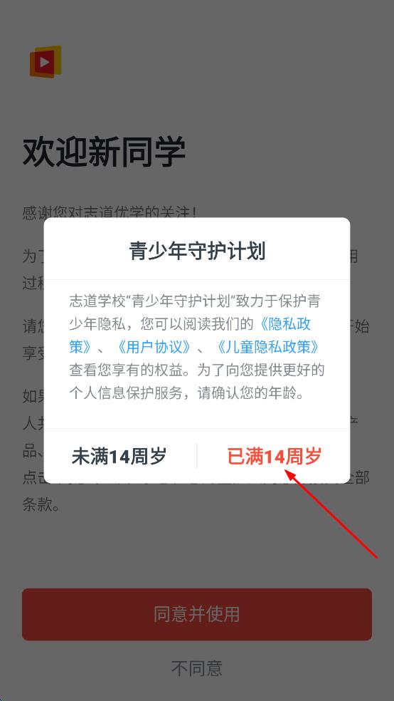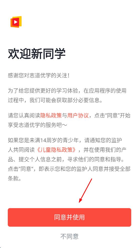 1、打開志道優(yōu)學(xué)APP,在“歡迎新同學(xué)”頁面,點(diǎn)擊“同意并使用”按鈕。