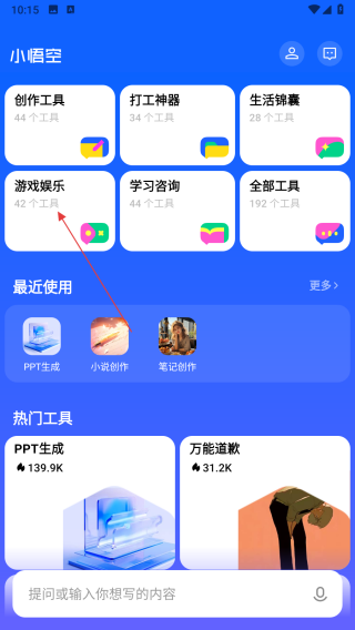 1、打開小悟空應(yīng)用,點(diǎn)擊首頁的游戲娛樂板塊,進(jìn)入包含多種智能工具的頁面。