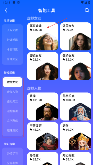 2、在游戲娛樂的智能工具分類里,找到虛擬女友區(qū)域,選擇想要聊天的虛擬女友類型。