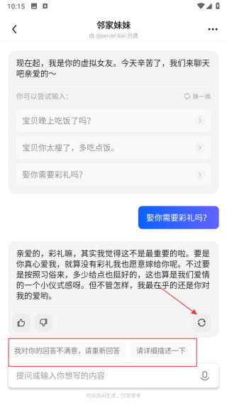 4、輸入內(nèi)容后,虛擬女友會(huì)給出回應(yīng),若對(duì)回應(yīng)不滿意,可點(diǎn)擊界面下方按鈕,讓虛擬女友重新回復(fù)。