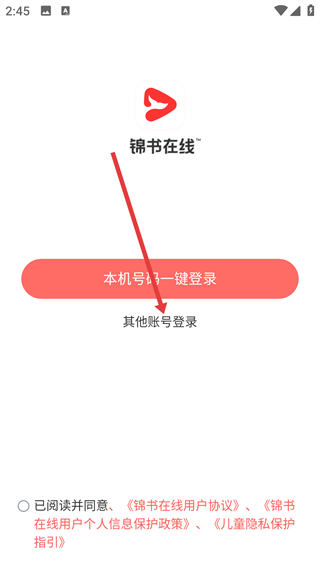 1、打開錦書在線app,點(diǎn)擊其他賬號(hào)登錄,進(jìn)入手機(jī)號(hào)登錄頁(yè)面。