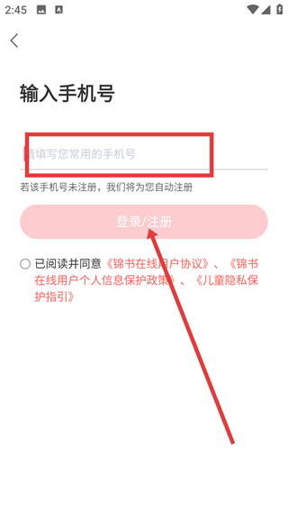 2、在輸入手機(jī)號(hào)頁(yè)面,填寫需要登錄的手機(jī)號(hào),點(diǎn)擊登錄/注冊(cè)。