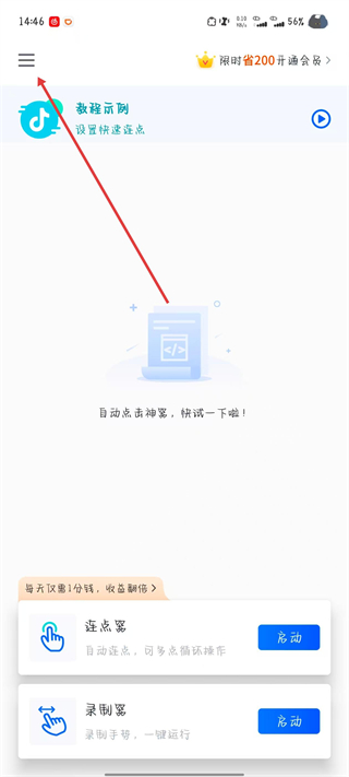 1、打開(kāi)萬(wàn)能點(diǎn)擊器應(yīng)用,點(diǎn)擊三條橫線。