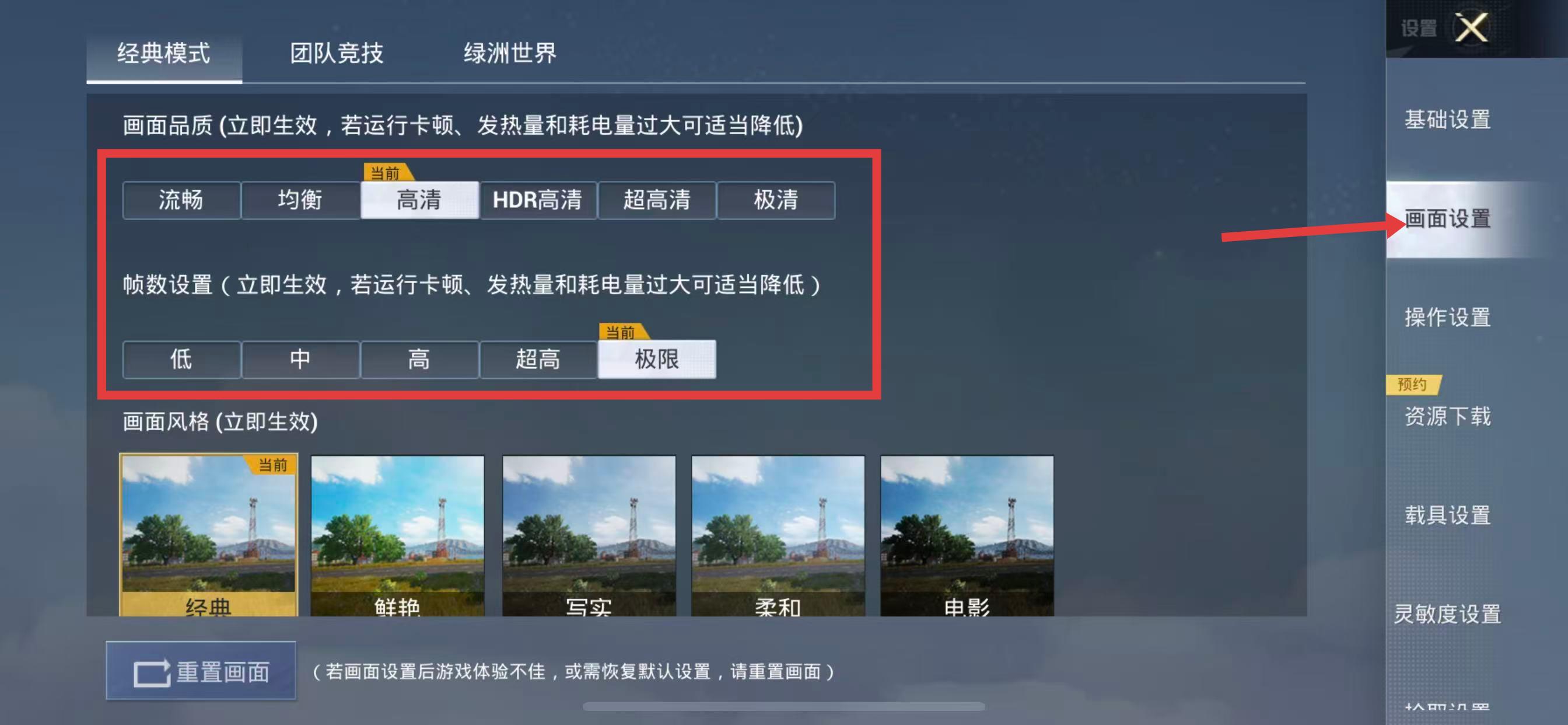 3、進入畫面設(shè)置選項,即可對畫面品質(zhì)和幀數(shù)設(shè)置等進行調(diào)整。