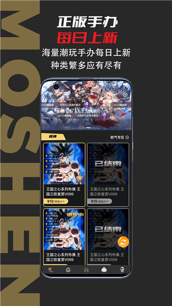 模神app可以預(yù)購(gòu)各種正版手辦模型,領(lǐng)取專屬新人優(yōu)惠,可以查看各種海外正版手辦漫畫(huà),客服全天在線,可以預(yù)購(gòu)最新款式,提供正版授權(quán),超多周邊可以購(gòu)買(mǎi)。你可以輕松買(mǎi)到你想要購(gòu)買(mǎi)的,每天都會(huì)上線,讓你買(mǎi)個(gè)不停,還能夠在軟件內(nèi)進(jìn)行開(kāi)盲盒,體驗(yàn)更多的驚喜,喜歡這款軟件的小伙伴趕快來(lái)下載吧。