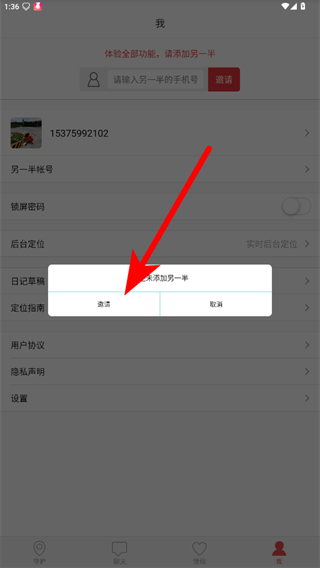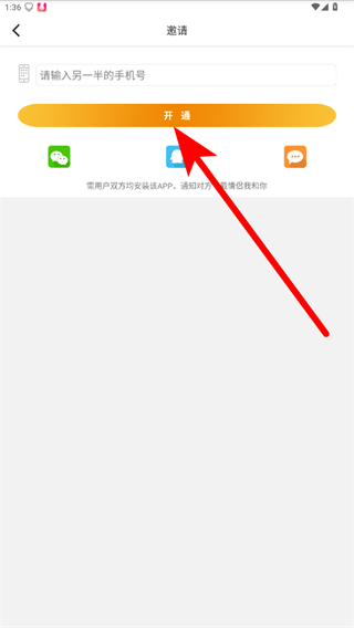 4、在邀請頁面,輸入對方的手機號,然后點擊開通,等待對方接受邀請并完成相應操作,即可成功綁定情侶關系。