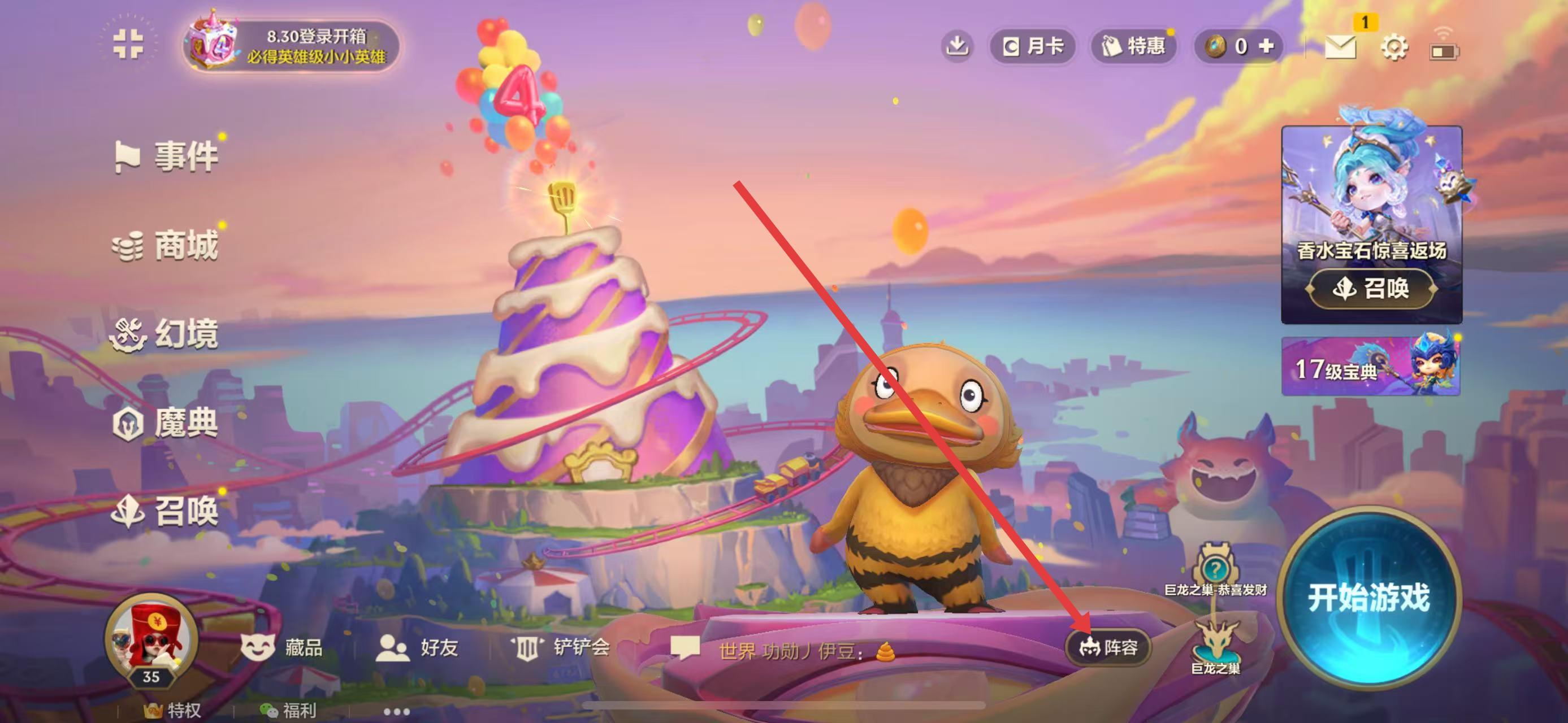 1、打開金鏟鏟之戰(zhàn)游戲,進(jìn)入主界面,點(diǎn)擊下方的陣容按鈕,進(jìn)入陣容界面。