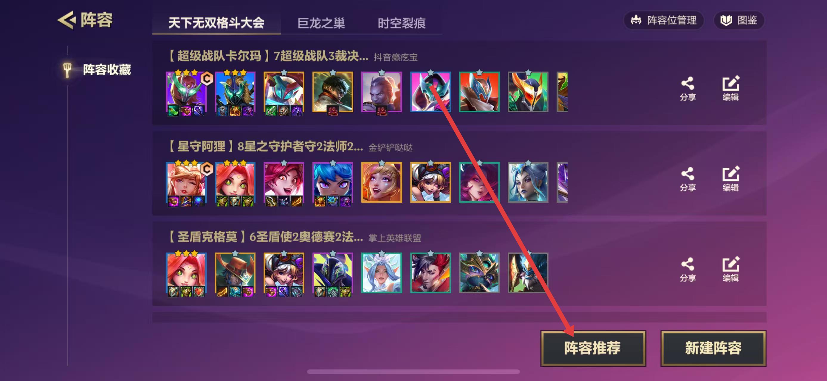 2、在陣容界面中,點(diǎn)擊下方的陣容推薦選項(xiàng),進(jìn)入微社區(qū)的陣容推薦頁面。