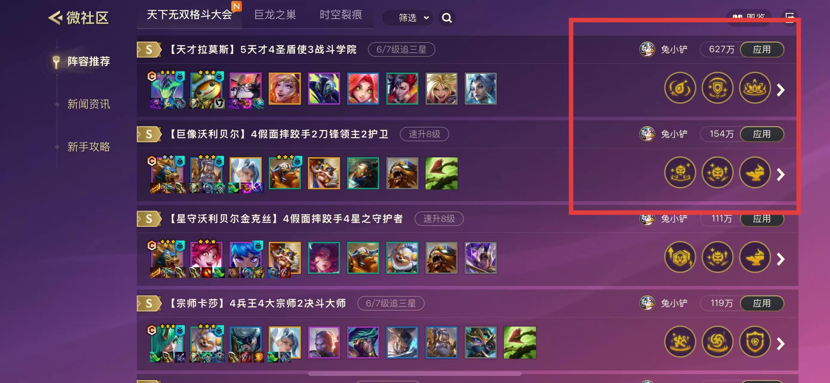3、在陣容推薦頁面,能看到各種不同的陣容推薦,包括陣容的組成英雄、強(qiáng)度評(píng)級(jí)等信息。點(diǎn)擊陣容右側(cè)的應(yīng)用,可快速設(shè)置該推薦陣容。