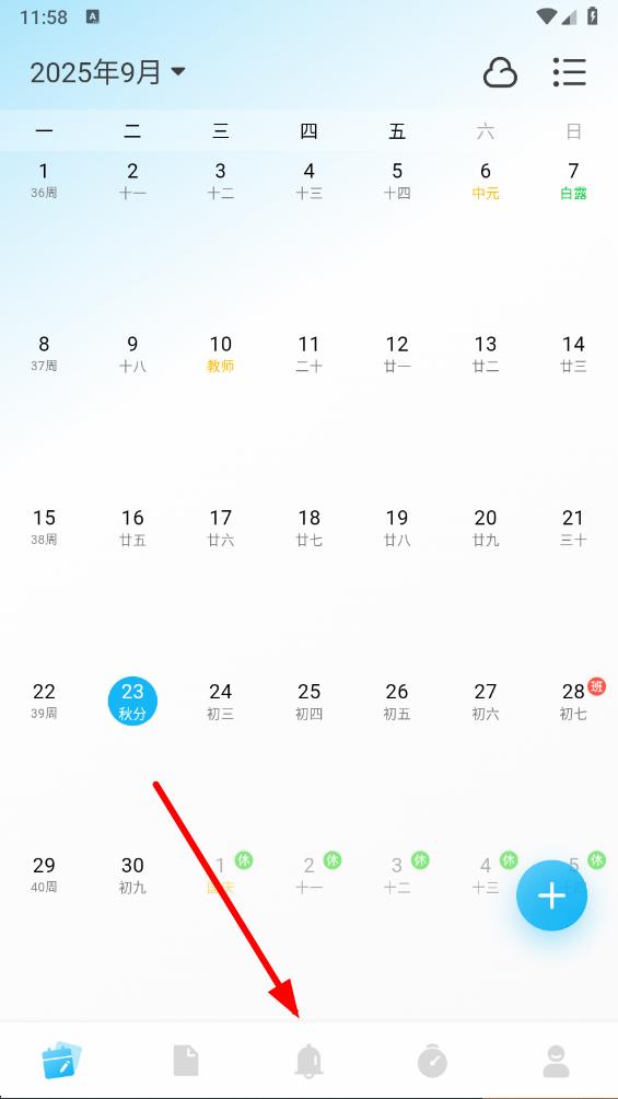 1、打開(kāi)日歷清單app,進(jìn)入日歷主界面,點(diǎn)擊底部導(dǎo)航欄中的鈴鐺圖標(biāo),進(jìn)入提醒頁(yè)面。