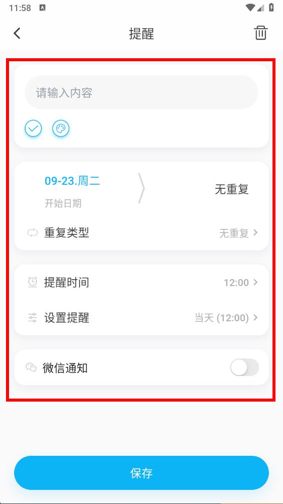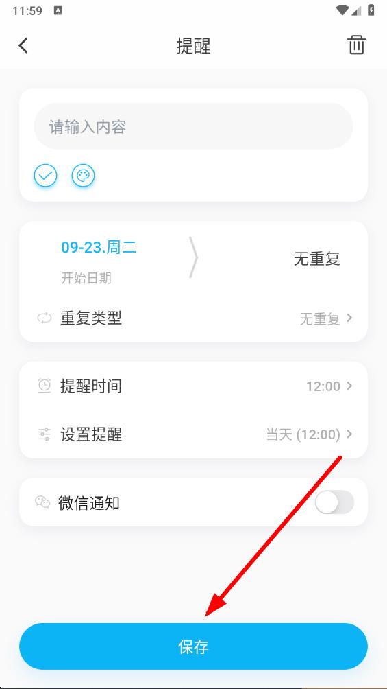 3、在提醒添加界面,輸入提醒內(nèi)容,設(shè)置開(kāi)始日期、重復(fù)類(lèi)型、提醒時(shí)間等相關(guān)信息,還可以選擇是否開(kāi)啟微信通知。