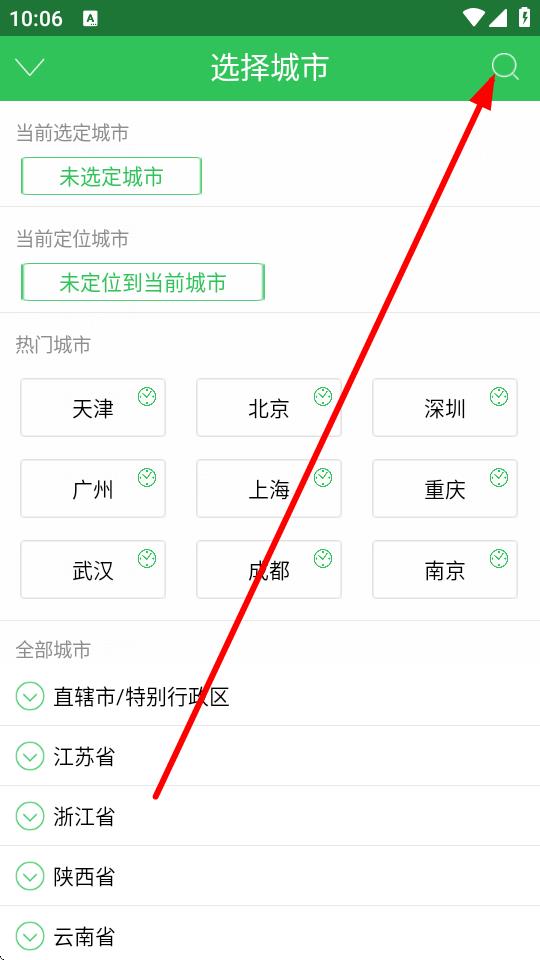 3、進(jìn)入選擇城市頁(yè)面后,點(diǎn)擊右上角的搜索圖標(biāo)。