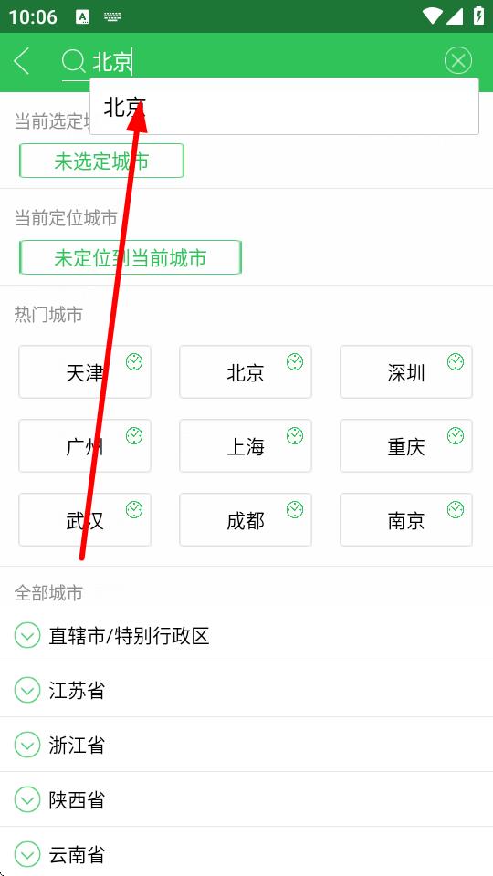 4、在搜索框輸入要切換的城市名稱,如北京,然后點(diǎn)擊搜索結(jié)果中的該城市,即可完成切換。