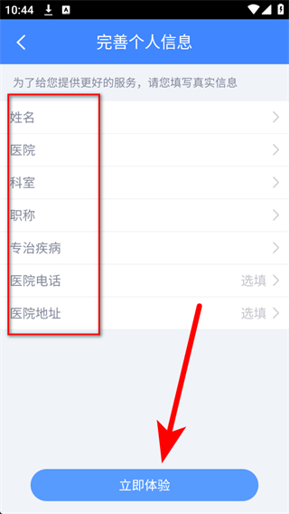 4、在完善個人信息頁面填寫姓名、醫(yī)院、科室等信息后,點擊立即體驗按鈕,即可完成注冊登錄。
