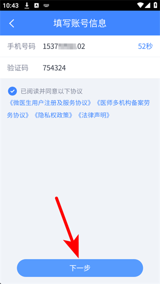 2、在填寫賬號信息頁面輸入手機號碼和驗證碼,勾選協(xié)議后點擊下一步按鈕。