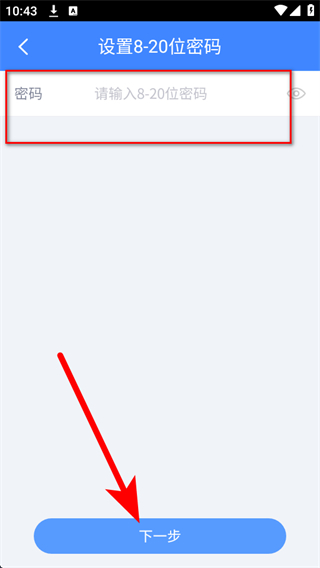 3、在設(shè)置密碼頁面輸入8-20位密碼后,點擊下一步按鈕。