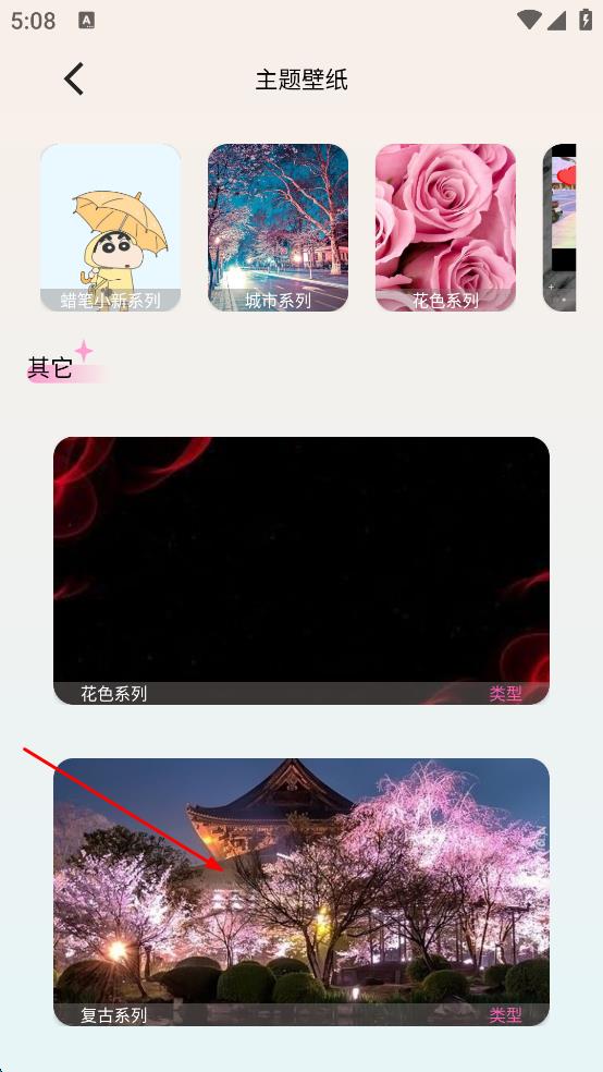 2、在主題壁紙頁面,滑動查找心儀的壁紙系列,點擊對應壁紙縮略圖,進入該壁紙的詳情展示頁面。