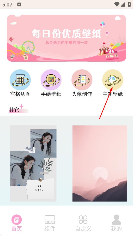 1、打開壁紙軟件,進入首頁,在功能區(qū)找到“主題壁紙”圖標并點擊,進入主題壁紙分類頁面,可瀏覽不同系列壁紙。