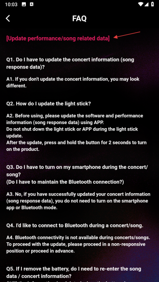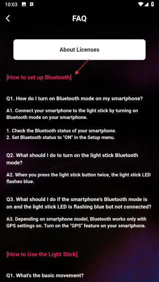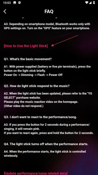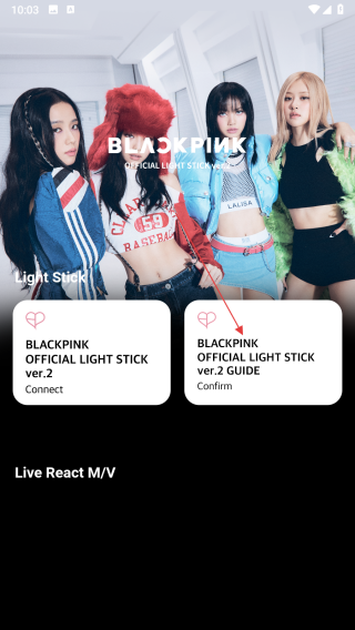 1、打開BLACKPINK官方應(yīng)援棒相關(guān)軟件,在主界面點(diǎn)擊BLACKPINK OFFICIAL LIGHT STICK ver.2 GUIDE選項(xiàng),進(jìn)入FAQ頁(yè)面。