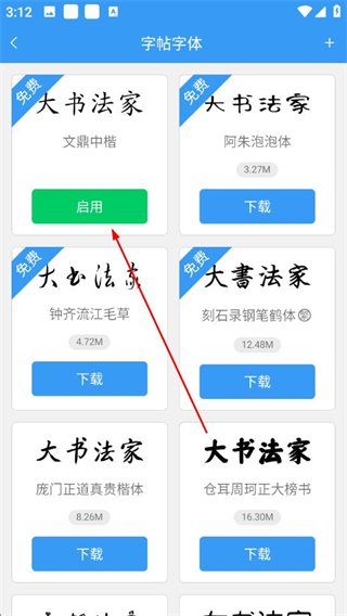 1、打開大書法家APP,在字帖字體頁面選擇喜歡的字體,點擊啟用。