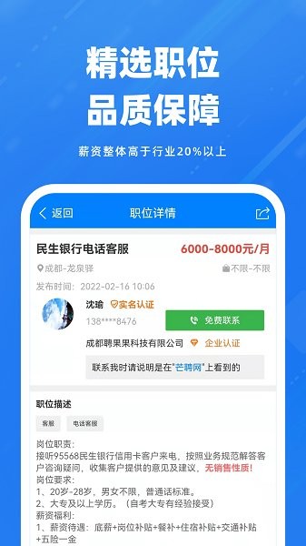 芒聘網(wǎng)專注小白領(lǐng)、藍(lán)領(lǐng)領(lǐng)域的專業(yè)招聘求職找工作平臺(tái),主要面向:客服、銷售、行政、人事、專業(yè)技術(shù)工人、普工、服務(wù)員、司機(jī)、物流、建筑、房地產(chǎn)、酒店等職業(yè)群體,精選行業(yè)優(yōu)秀頭部企業(yè)和職位,所有職位經(jīng)過(guò)優(yōu)選認(rèn)證,真實(shí)可信,薪資整體高于行業(yè)20%以上;企業(yè)、職位、薪資、崗位經(jīng)過(guò)嚴(yán)格認(rèn)證,提升溝通效率;芒聘網(wǎng)同時(shí)提供免費(fèi)委托找工作模式,從委托時(shí)間開(kāi)始,根據(jù)求職意向,1V1專家服務(wù),24小時(shí)內(nèi)匹配到滿意工作為止,大幅提升找工作效率,平臺(tái)委托服務(wù)完全免費(fèi),不收取任何費(fèi)用。