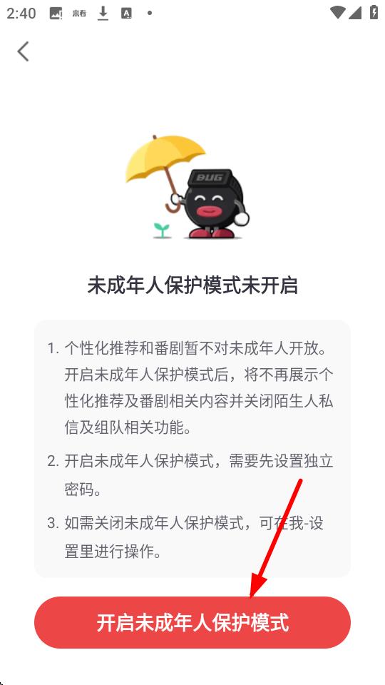 4、在未成年人保護(hù)模式介紹頁面,點(diǎn)擊開啟未成年人保護(hù)模式按鈕,按提示完成設(shè)置。