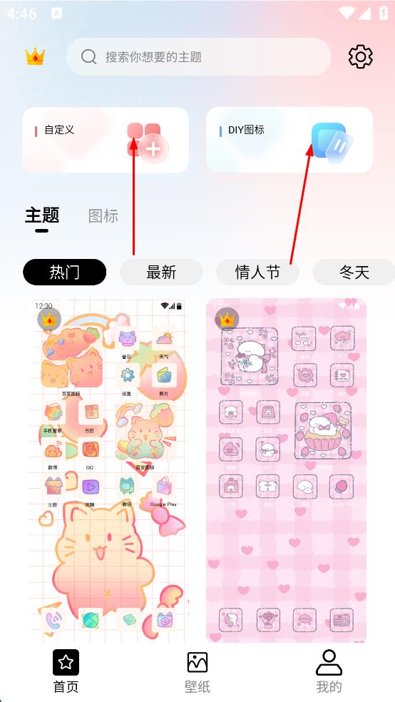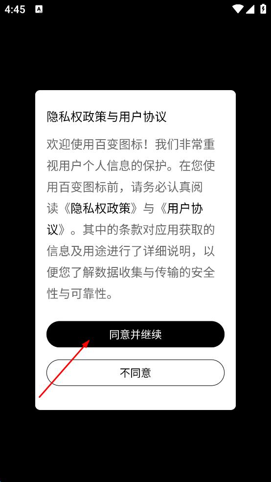 1、打開百變圖標(biāo)APP,閱讀隱私權(quán)政策與用戶協(xié)議后點(diǎn)擊“同意并繼續(xù)”,進(jìn)入首頁,選擇“自定義”或“DIY圖標(biāo)”功能入口。