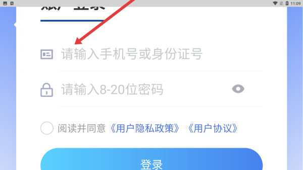 3、進(jìn)入登錄界面,在請輸入手機(jī)號或身份證號框填寫信息,為醫(yī)保賬號登錄做準(zhǔn)備。