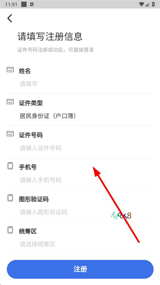 4、在注冊信息填寫頁面,依次輸入姓名、證件號碼、手機(jī)號、圖形驗(yàn)證碼,選擇統(tǒng)籌區(qū),點(diǎn)擊注冊按鈕完成賬號注冊。