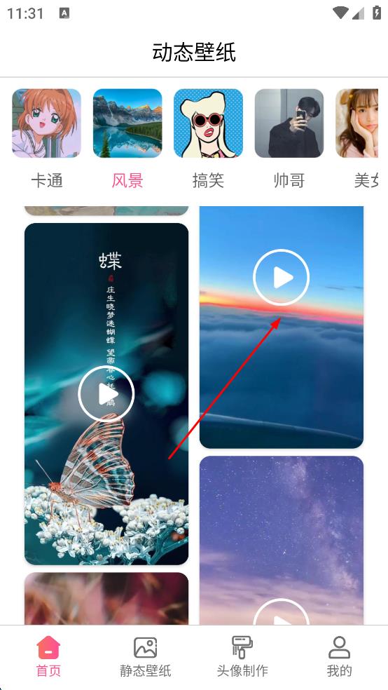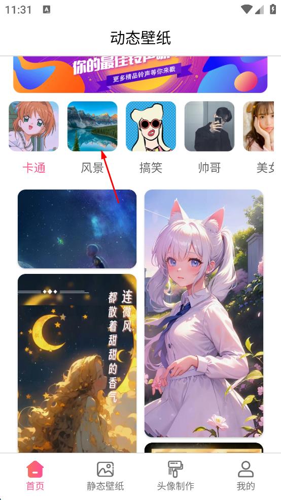 1、打開動(dòng)態(tài)壁紙軟件,進(jìn)入主界面后,在上方的分類欄中,點(diǎn)擊“風(fēng)景”選項(xiàng),切換到風(fēng)景類動(dòng)態(tài)壁紙展示頁(yè)面。