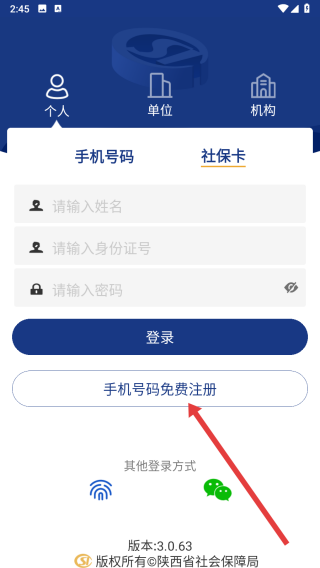 2、進(jìn)入到登錄頁(yè)面時(shí),若沒有賬號(hào),可以點(diǎn)擊手機(jī)號(hào)碼免費(fèi)注冊(cè)按鈕注冊(cè)賬號(hào)。