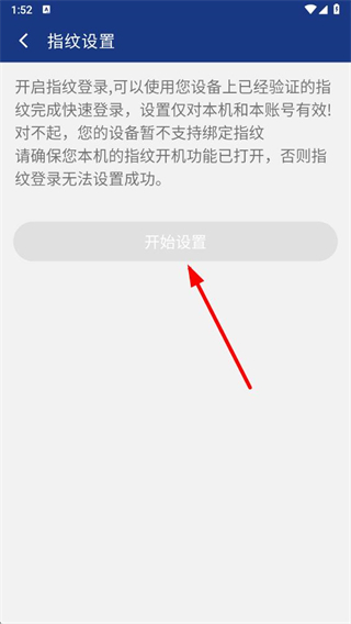 4、進(jìn)入指紋設(shè)置頁(yè)面后,若設(shè)備支持指紋功能,可點(diǎn)擊開始設(shè)置按鈕,按提示完成指紋登錄的綁定。