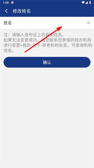 3、在修改姓名頁(yè)面,在姓名輸入框中填寫身份證上的真實(shí)姓名,填寫后點(diǎn)擊確認(rèn)按鈕提交修改。