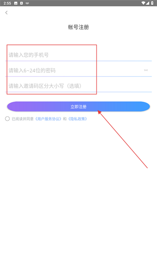 4、輸入注冊的手機號、密碼以及邀請碼,再點擊立即注冊的按鈕。