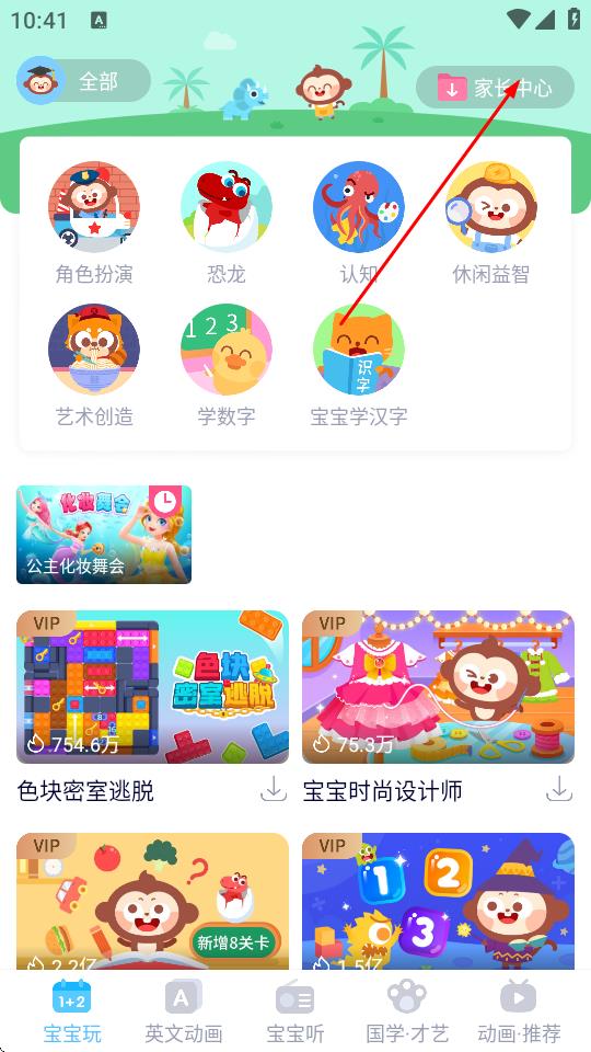 2、進(jìn)入APP主界面,點(diǎn)擊右上角的家長(zhǎng)中心。