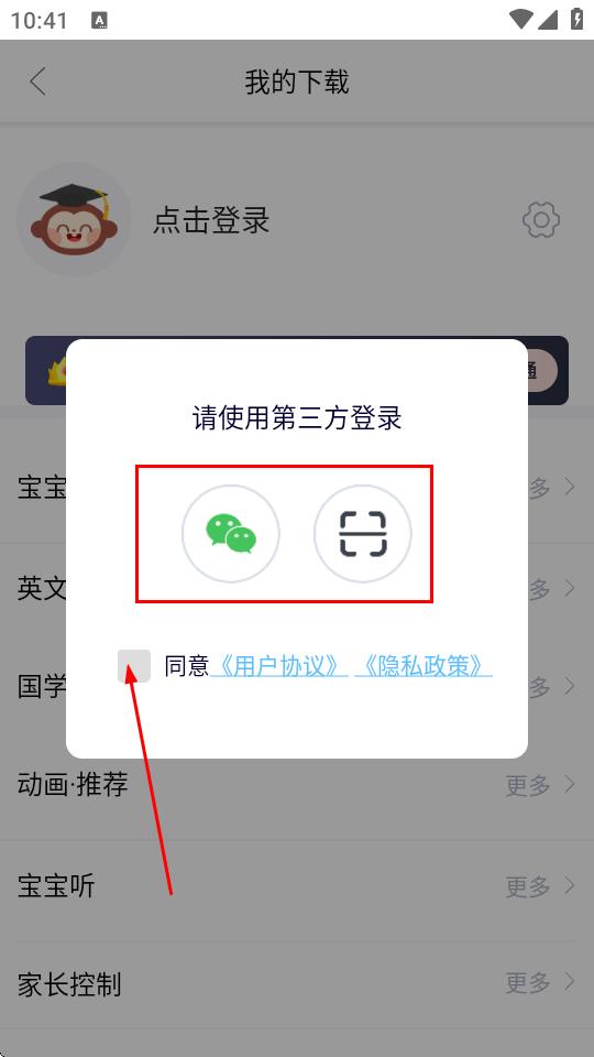 4、在彈出的請(qǐng)使用第三方登錄”窗口中,選擇登錄方式,勾選同意用戶協(xié)議隱私政策,完成登錄操作。
