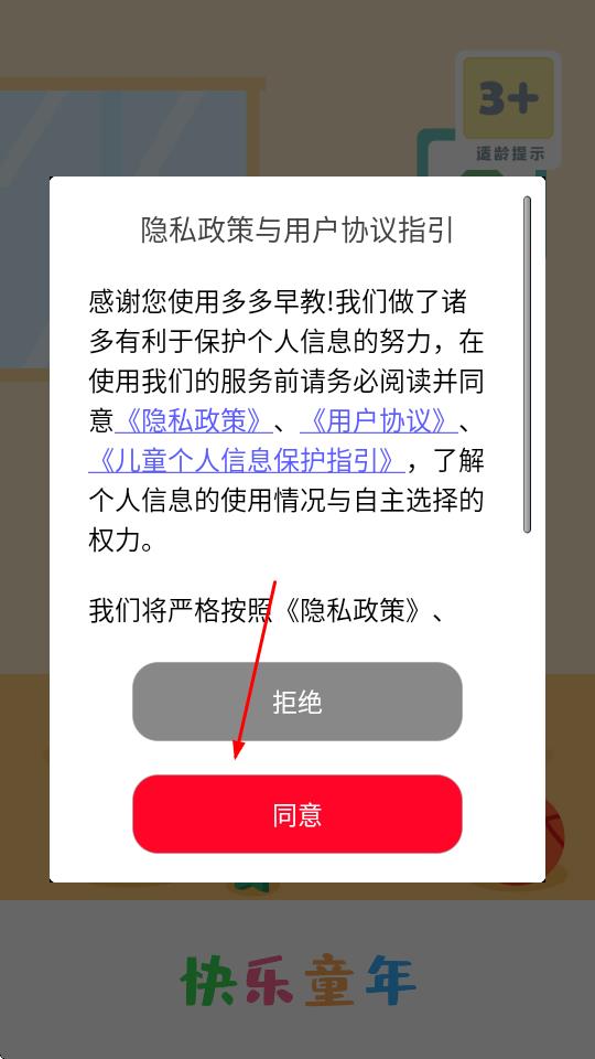 1、打開(kāi)多多早教APP,在彈出的隱私政策與用戶協(xié)議指引頁(yè)面,點(diǎn)擊同意。