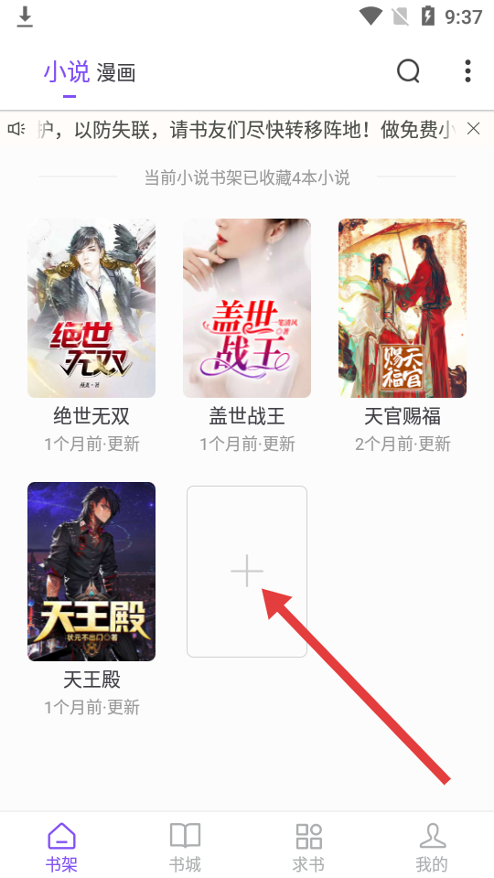 1、在書架頁點(diǎn)擊加號(hào)按鈕,可以添加新的小說到我的書架。