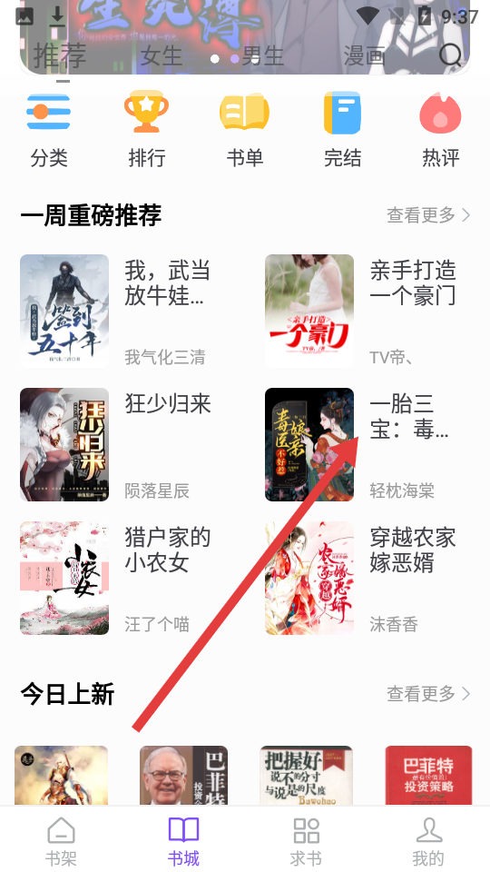 2、跳轉(zhuǎn)到書城頁之后,選擇心儀的小說,點(diǎn)擊封面進(jìn)入小說詳情頁。