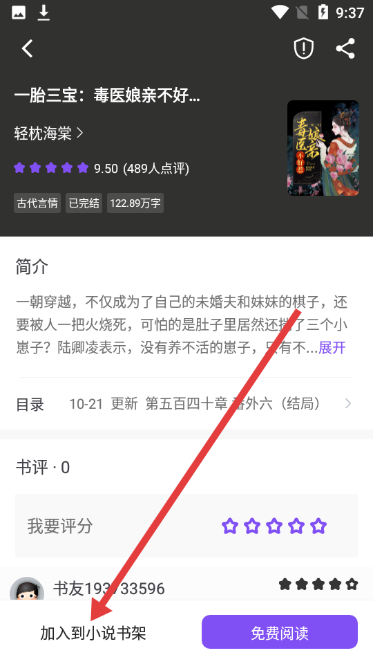 3、在小說詳情頁面,找到左下角的加入到小說書架按鍵,點(diǎn)擊完成添加小說操作。