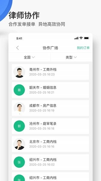 律師協(xié)作:通過平臺在線發(fā)單、接單,幫助尋找靠譜律師合作,高效解決異地查檔、案件協(xié)作、案件代理等問題。