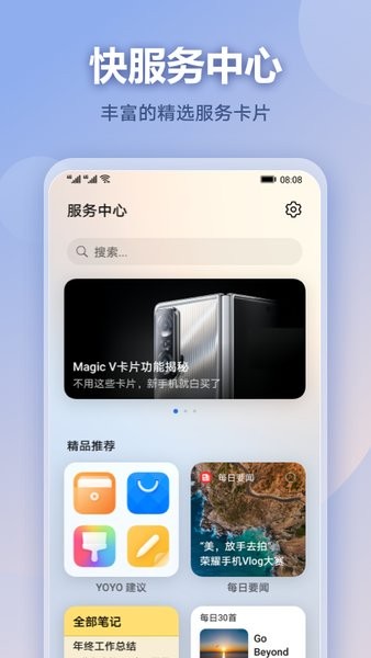 快服務(wù)中心,是發(fā)現(xiàn)和管理服務(wù)卡片的統(tǒng)一入口,可通過搜索查找您想要的卡片。目前只支持magicui6.0版本以上的手機(jī)用戶使用,為用戶提供優(yōu)質(zhì)卡片服務(wù)。