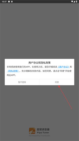 1、啟動琵琶調(diào)音器的應(yīng)用軟件,進(jìn)入時(shí)會跳出用戶協(xié)議和隱私政策,點(diǎn)擊同意的按鈕。
