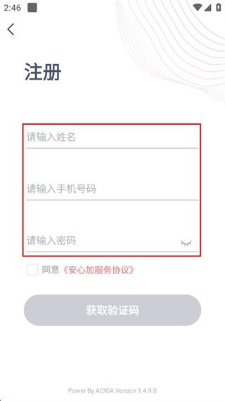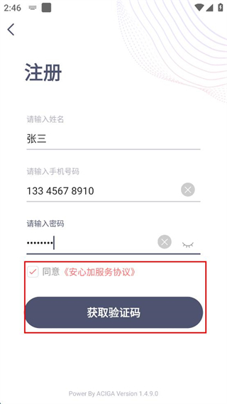 3、在注冊界面,輸入姓名、手機(jī)號碼、密碼,勾選同意服務(wù)協(xié)議。