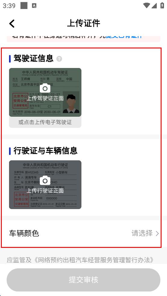 3、進入上傳證件頁面,按照要求,分別上傳駕駛證正面以及行駛證正面,再選擇車輛顏色等車輛相關信息。