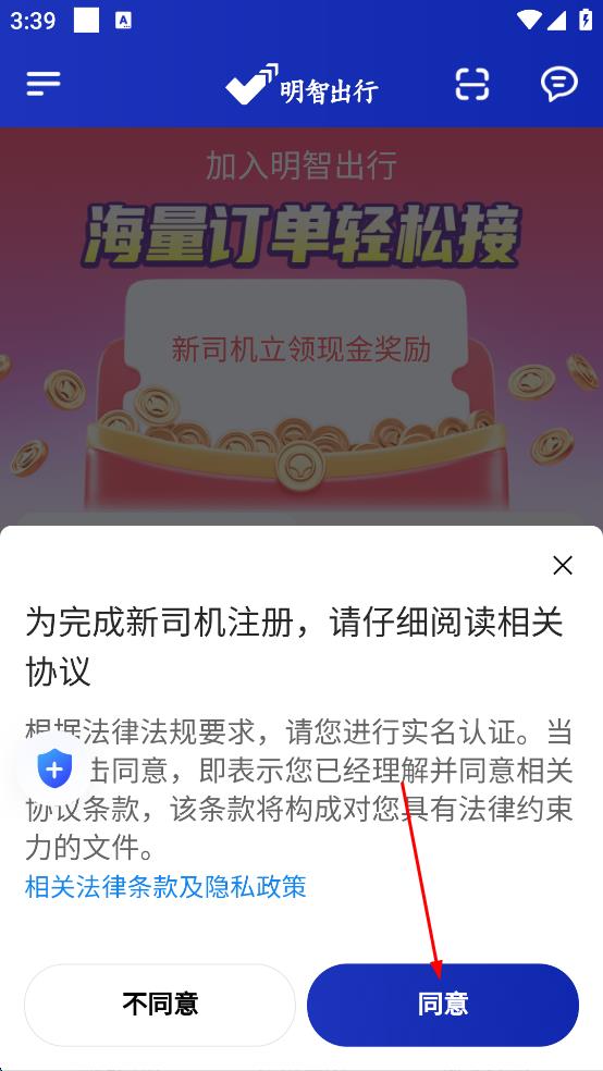 2、選擇好城市后,會彈出新司機注冊相關協(xié)議彈窗,仔細閱讀協(xié)議內(nèi)容,然后點擊“同意”按鈕,進入下一步。